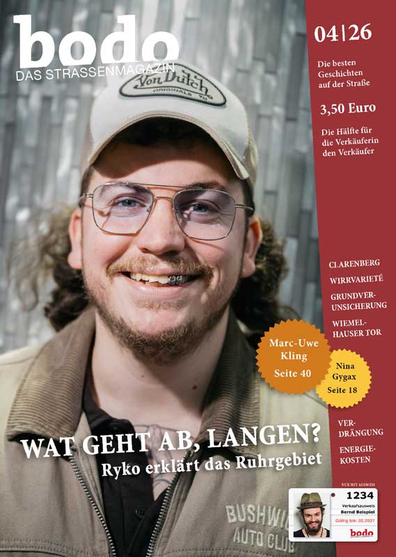 Die Redaktion des Straßenmagazins bodo wirbt für die heute erschienene April-Ausgabe: »Der Essener Ryko brilliert mit prolliger Schlaumeierei im Feinripp-Unterhemd ebenso wie mit messerscharfen Reflexionen über Depressionen, Bodyshaming und Feminismus. Roh und tiefgründig, selbstironisch und authentisch. 170.000 Follower feiern ihn dafür auf Instagram – und auf der Straße. Nina Gygax leitet die Dortmunder JVA. Ihr Ziel: „Niemand soll bei Streitigkeiten verletzt werden.