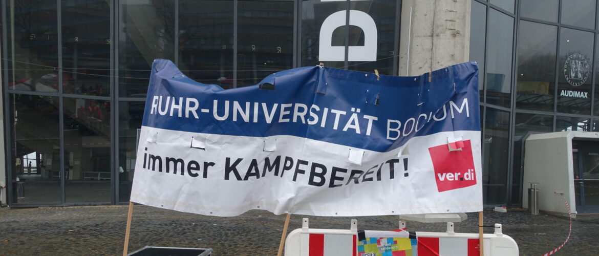 An der Ruhr-Uni fand gestern – wie an 80 anderen Hochschulen auch – ein Warnstreik statt. Auf der Kundgebung vor dem Audimax thematisierte der ver.di Geschäftsführer Ruhr Mitte Bernd Dreisbusch einen Skandal im Umgang mit studentischen Hilfskräften im Hochschulbereich: »Den 300.000 studentisch Beschäftigten verweigert die TDL [Tarifgemeinschaft deutscher Länder] weiterhin jeglichen Schutz durch einen Tarifvertrag. Ja, bin ich denn hier bei Amazon, nein, beim Land Nordrhein-Westfalen.«