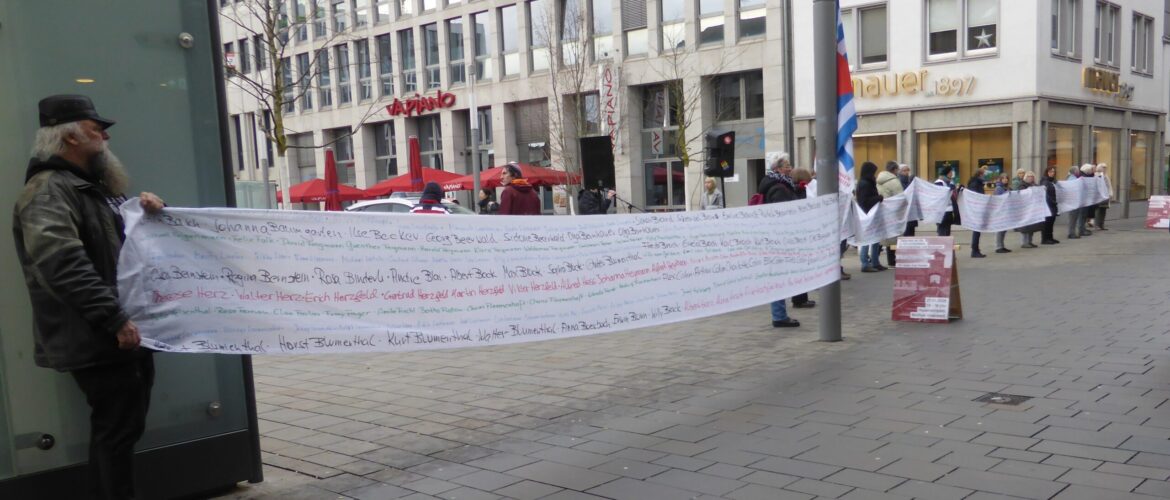 In Bochum wird seit vielen Jahren an diesem Tag an die jüdischen Bochumer Opfer gedacht. Ihre Namen sind auf langen Bannern aufgeschrieben und werden vorgelesen.