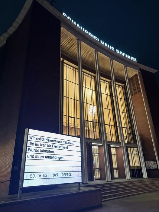 Das Schauspielhaus Bochum lädt zu einem Solidaritäts-Abend für Iran ein: »Wir sind erschüttert angesichts der Brutalität, mit der das iranische Regime gegen die eigene Bevölkerung vorgeht. Um unsere Solidarität mit den Menschen im Iran und ihren Angehörigen auszudrücken, laden wir am Sonntag, den 15.02. um 18 Uhr ins Oval Office ein zu einem Soli-Abend – mit Musik, Texten, künstlerischen Beiträgen von Freund*innen und einer Gesprächsrunde bei freiem Eintritt. Im Anschluss gibt es die Möglichkeit, im Tanas bei persischem Essen das Gespräch weiterzuführen.