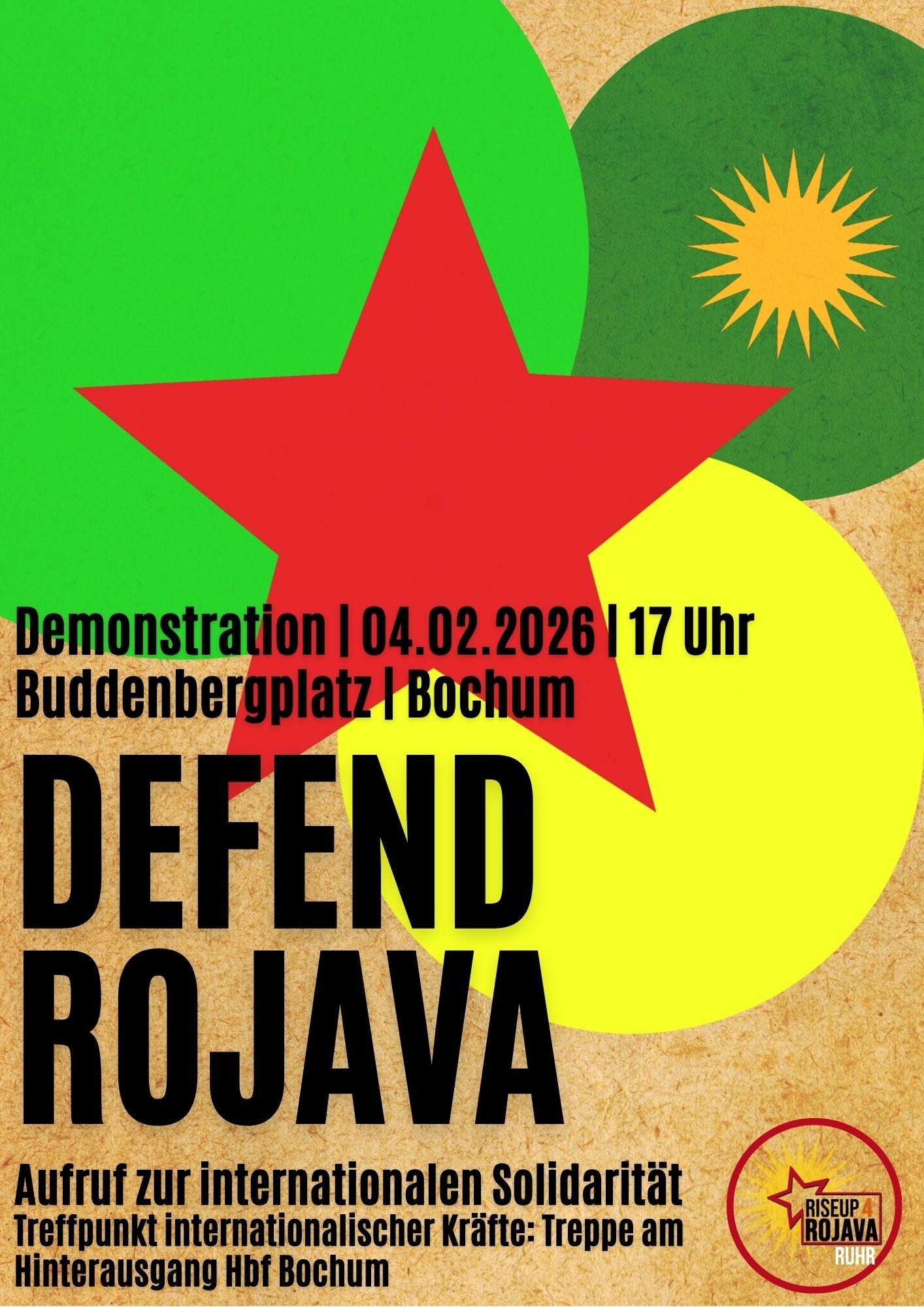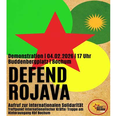 Riseup 4 Rojava ruft am Mittwoch, dem 4. 2. um 17 Uhr am Buddenbergplatz zur Demonstration auf: »Lasst uns am Mittwoch gemeinsam auf die Straße gehen, um für die Errungenschaften der Revolution in Rojava einzutreten, für die Menschen, die dort leben, und für den Aufbau einer freien Gesellschaft weltweit. Das Gesellschaftsprojekt in Nord-/Ost-Syrien, das auf dem Demokratischen Konföderalismus basiert, sieht sich weiter schwerwiegenden Bedrohungen durch die islamistische Übergangsregierung Syriens, den Islamischen Staat und die Türkei ausgesetzt.