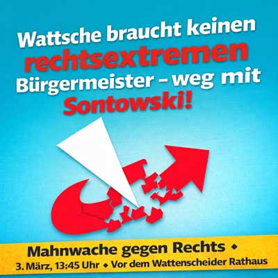 Am Dienstag, 3.3. findet auf dem Betti-Hartmann-Platz in Wattenscheid die 2. Mahnwache für eine Bezirksvertretung ohne einen stellvertretenden AFD-Bürgermeister statt. Unterstützt wird dabei auch die Resolution der anderen Fraktionen in Wattenscheid, die ihn zum Rücktritt auffordern, sowie die Forderung der der Linken Bochum: Linke unterstützt Resolution zum Rücktritt von Sontowski – Bewegung in Bochum.
