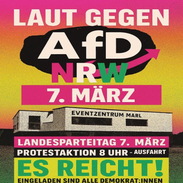 Das Bochumer Bündnis gegen Rechts und der NRW-Appell AfD-Verbot rufen dazu auf, am nächsten Samstag, 7. März in Marl gegen den Landesparteitag der AfD zu protestieren. Um 8 Uhr beginnen vor dem Eventzentrum die Proteste, die von örtlichen Initiativen und dem DGB organisiert werden. Es ist wichtig, dass diese Initiativen aus ganz NRW unterstützt werden, denn das Erstarken der radikalen Rechten bei den letzten Kommunalwahlen zeigt bereits überall Spuren. Noch können sie zwar nichts durchsetzen, aber mit unverhohlenen Angriffen auf die Zivilgesellschaft und mit Vorstößen zur Streichung sämtlicher Mittel etwa für die freie Kultur drängen sie immer mehr auf die Agenda kommunaler Politik.
