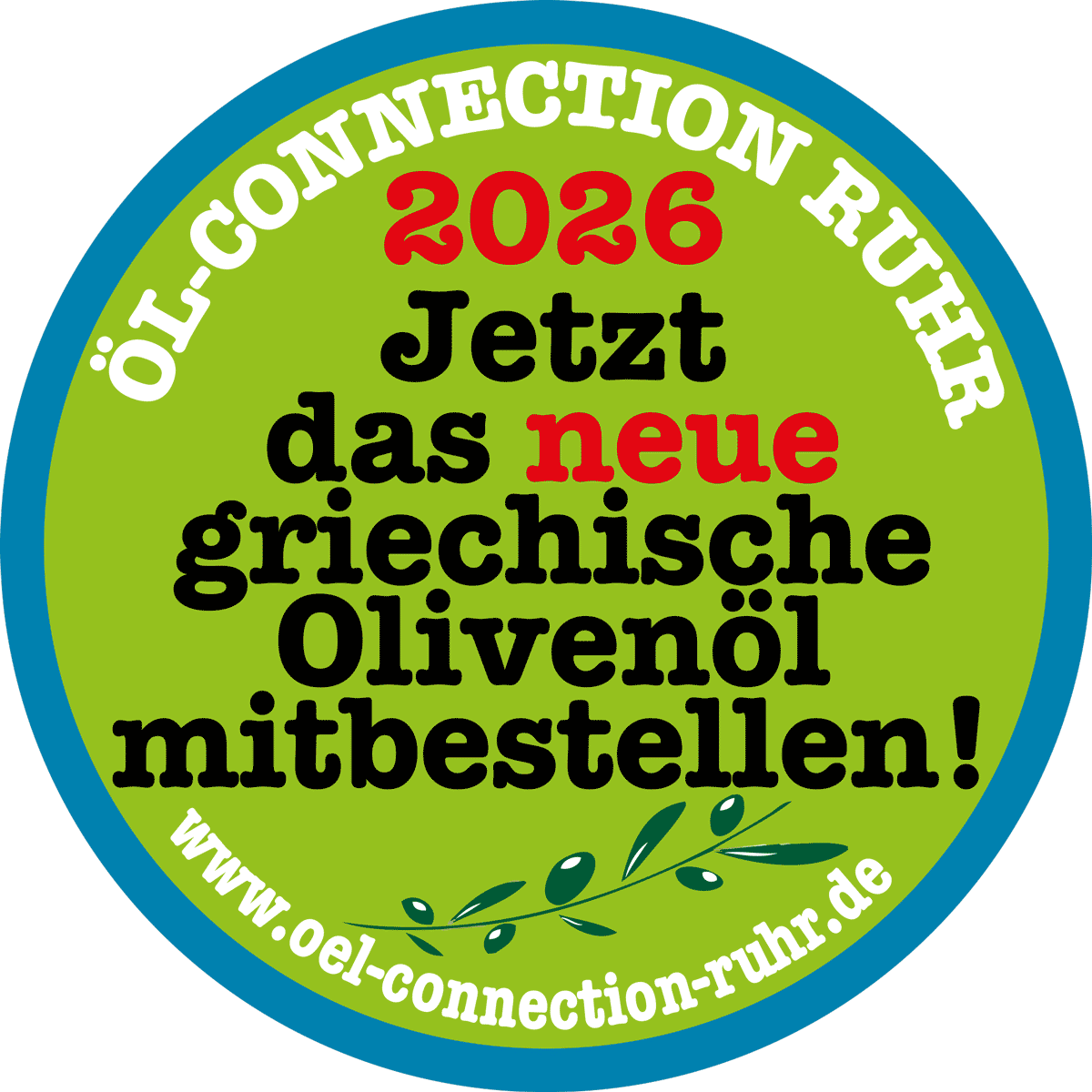 Die Öl-Connection-Ruhr bietet auch 2026 wieder fair gehandeltes Olivenöl über die Öl-Connection-Ruhr zum Mitbestellen und selber abholen und informiert: »Noch bis zum 22. Februar ist die Mitbestellung direkt über das Mitbestellformular möglich: Wir freuen uns mit Ausgabe des fair und solidarisch gehandelten Olivenöls aus Griechenland in diesem Jahr wieder in der Quartiershalle der KoFabrik in Bochum zu sein. Die Ölausgabe 2026 wird am Samstag, den 28. Februar und Sonntag, den 01. März 2026, jeweils von 11:00 Uhr bis 17:00 Uhr in der KoFabrik, Stühmeyerstraße 33, 44787 Bochum stattfinden.