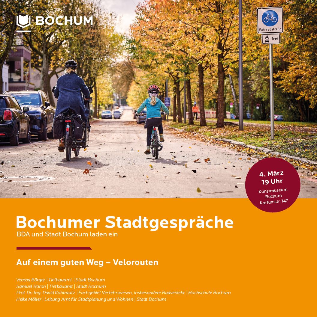 Die Stadt Bochum lädt wieder zu ihrer Reihe „Bochumer Stadtgespräche“ ins Kunstmuseum an der Kortumstraße 147 ein. Am Mittwoch, 4. März, geht es ab 19 Uhr um das Thema „Velorouten“. Der Eintritt ist frei, eine Anmeldung nicht erforderlich.
