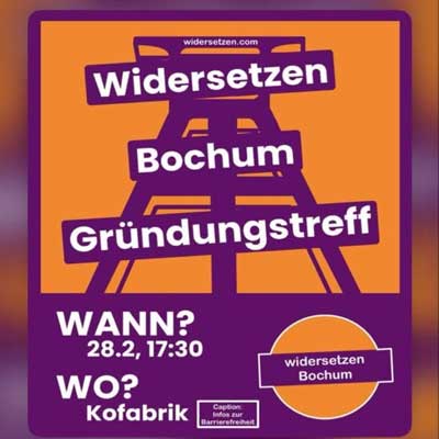 Am nächsten Samstag findet ein lokales Gründungstreffen von der Initiative „Widersetzen“ in der KoFabrik statt. Der Aufruf: »Essen. Riesa. Gießen. Seit mittlerweile über einem Jahr widersetzen sich Tausende Menschen aus ganz Deutschland der AfD und organisieren sich in zahlreichen Städten – und jetzt bald auch in Bochum! Widerstand wie dieser wird in Zeiten wie diesen so dringend gebraucht wie lange nicht mehr – also widersetze auch Du dich und komme am 28. Februar um 17:30 in die Kofabrik zu dem Gründungstreff der Widersetzen-Ortsgruppe Bochum!