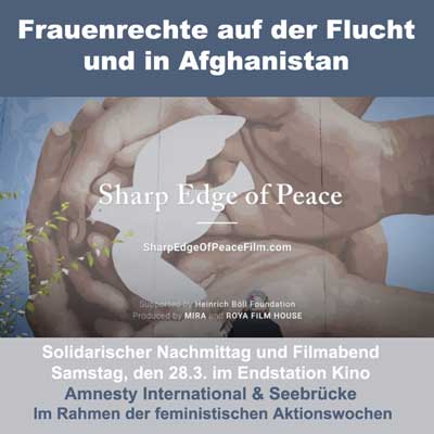 Im Rahmen der feministischen Aktionswochen bieten Seebrücke und Amnesty am Samstag, den 28.3. Gelegenheit zum Austausch mit FLINTA* mit Fluchterfahrung und zeigen den Dokumentarfilm „The Sharp Edge of Peace“ der afghanischen Regisseurin Roya Sadat. Sie wird anschließend aus dem Exil in den USA zum Filmgespräch zugeschaltet. Beide Veranstaltungen finden im Endstation Kino in Langendreer statt.