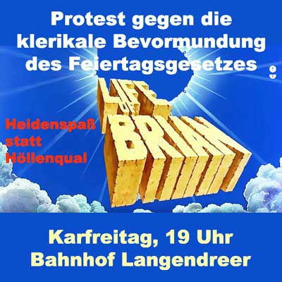 Religionsfrei im Revier zeigt seit 13 Jahren am Karfreitag den Film „Das Leben des Brian“. Dies ist eigentlich durch das Feiertagsgesetz NRW verboten und wurde anfangs auch bestraft. Seit einer Entscheidung des Bundesverfassungsgerichtes wird es von der Bezirksregierung Arnsberg erlaubt, obwohl das Feiertagsgesetz nicht geändert wurde. Dieses Jahr läuft das ganze erneut im Bahnhof Langendreer. Ab 19 Uhr gibt es ein Vorprogramm um 20 Uhr startet „Brian“. Nebenan im Kino Endstation wird für alle, die den Brian Film schon häufiger gesehen haben, „Das brandneue Testament“ gezeigt. Der Eintritt ist frei.