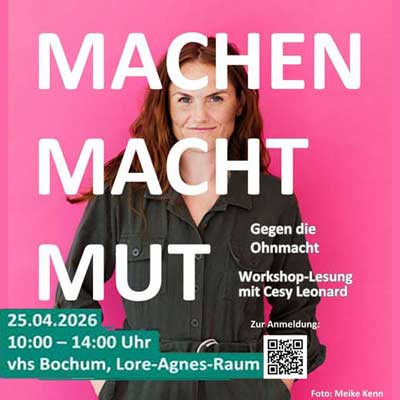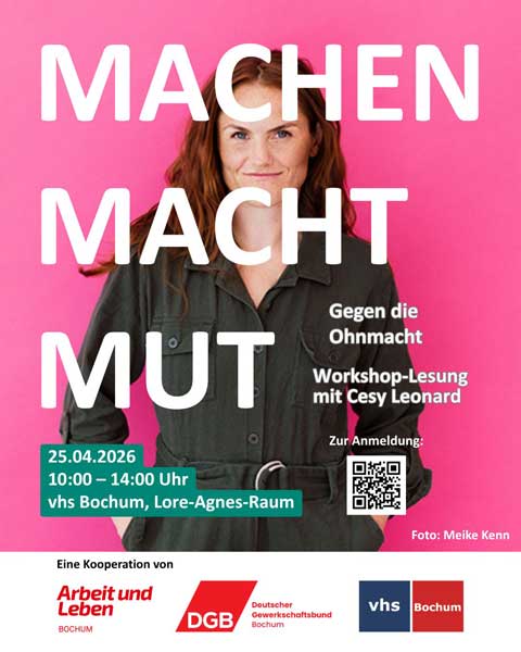 DGB und Volkshochschule laden am Samstag, den 25. April von 10 – 14 Uhr zu einer Interaktiven Lesung mit Cesy Leonard ein: »In einer Welt, die von Krisen, Krieg und Rückschritt geprägt ist, wächst das Gefühl der Ohnmacht – besonders bei denen, die sich für ein demokratisches, feministisches und gerechtes Morgen einsetzen. Cesy Leonard, Aktionskünstlerin und Gründerin der Radikalen Töchter, will genau hier ansetzen: mit Mut. Mit ihrer interaktiven Lesung und dem Buch „Machen Macht Mut“ ruft sie dazu auf, Wut in Kraft, Schmerz in Solidarität und Angst in Handeln zu verwandeln.