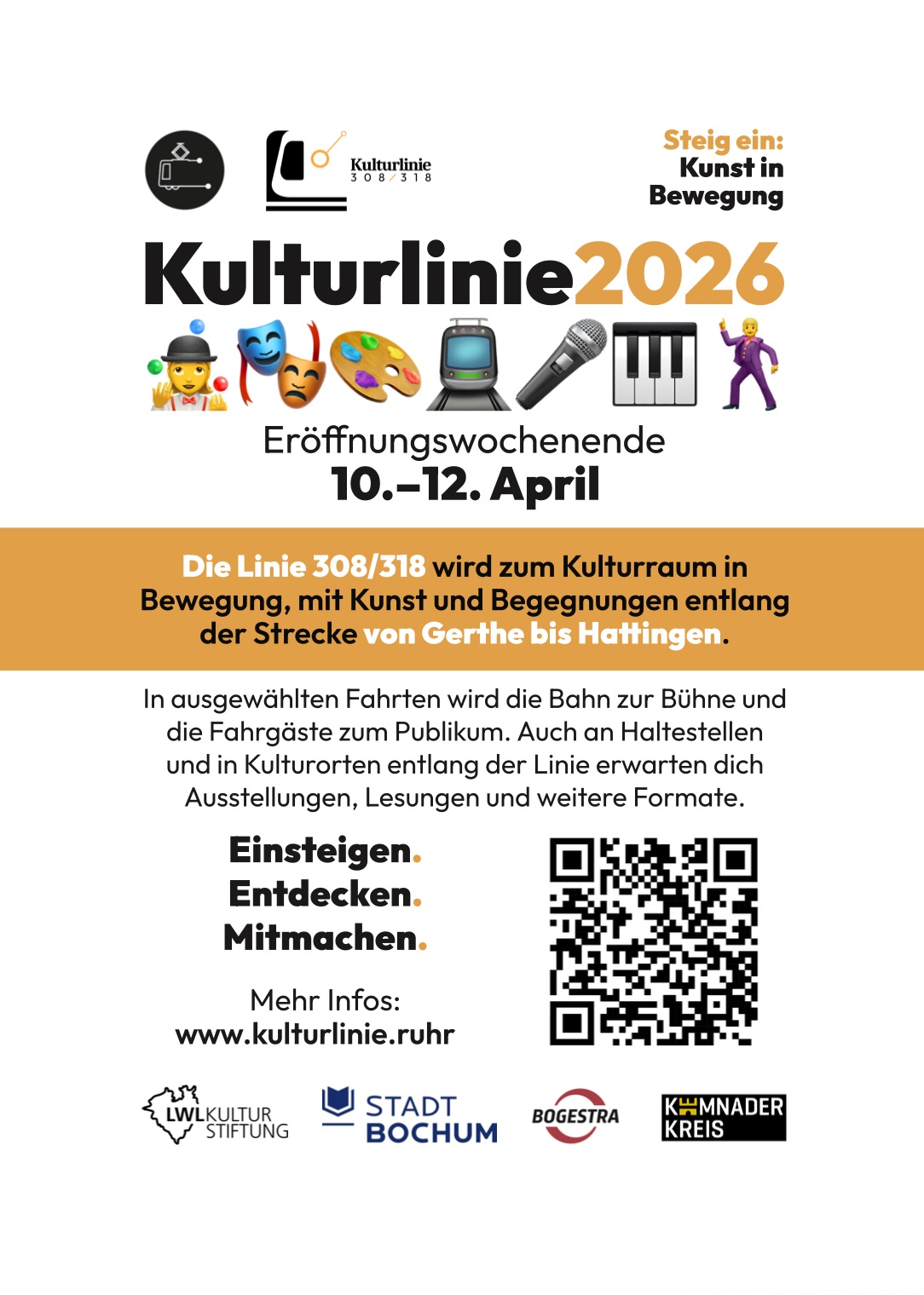 Neue Perspektiven entdecken, den Puls der Bochumer Kreativität spüren und besondere Orte entlang der Kulturlinie 308/318 erkunden. Werde Teil einer lebendigen Reise, die Menschen, Kunst und Stadt miteinander verbindet.