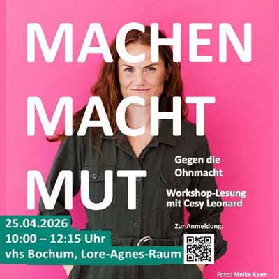 mehr…DGB und Volkshochschule laden am Samstag, den 25. April von 10 – 14 Uhr zu einer Interaktiven Lesung mit Cesy Leonard ein: »In einer Welt, die von Krisen, Krieg und Rückschritt geprägt ist, wächst das Gefühl der Ohnmacht – besonders bei denen, die sich für ein demokratisches, feministisches und gerechtes Morgen einsetzen. Cesy Leonard, Aktionskünstlerin und Gründerin der Radikalen Töchter, will genau hier ansetzen: mit Mut. Mit ihrer interaktiven Lesung und dem Buch „Machen Macht Mut“ ruft sie dazu auf, Wut in Kraft, Schmerz in Solidarität und Angst in Handeln zu verwandeln.