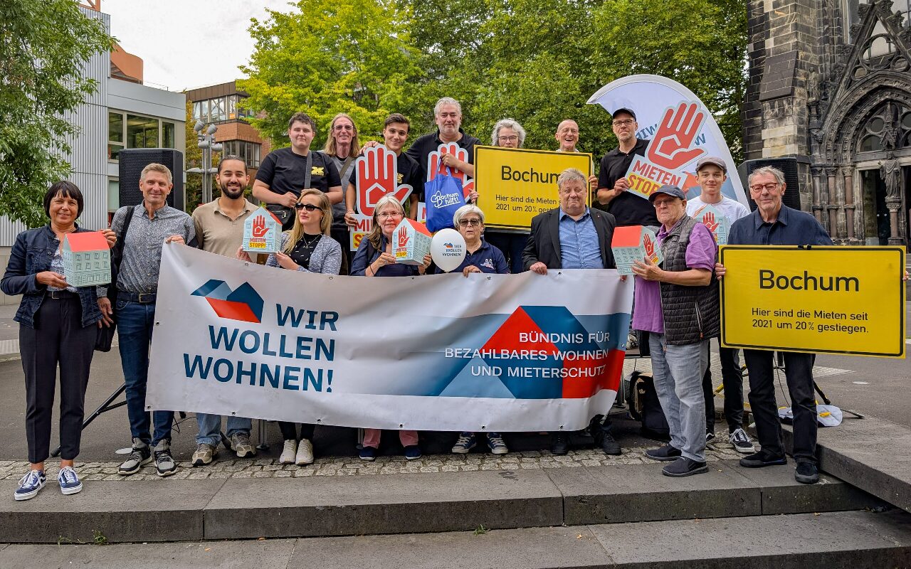 »Im Rahmen des landesweiten Aktionstages des Bündnisses „Wir wollen wohnen“ folgten am 29.August über 80 Menschen dem Aufruf zu einer Kundgebung. Die Bochumer Veranstalter:innen sehen in Bezahlbarem Wohnen eine der zentralen sozialen Fragen unserer Zeit. Die Mieten steigen, Sozialwohnungen verschwinden, und Menschen mit geringem Einkommen werden verdrängt oder gar wohnungslos. Allein seit 2021 sind die Angebotsmieten in Bochum um mehr als 20 Prozent gestiegen.