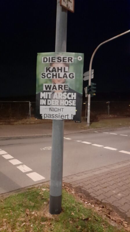 Dazu waren Verwaltung und Politik im Rathaus aber nicht bereit. Offenbar rechnete sich das Bauvorhaben wirtschaftlich nur mit Gewerbeblock. Im Januar 2025 wurde der Wald vollständig vernichtet. Dass der Kahlschlag nicht so schnell vergessen sein würde, hat jemand unter Anspielung auf ein von den Grünen im Bundestagswahlkampf verwendetes Plakat an der Markstraße deutlich gemacht.