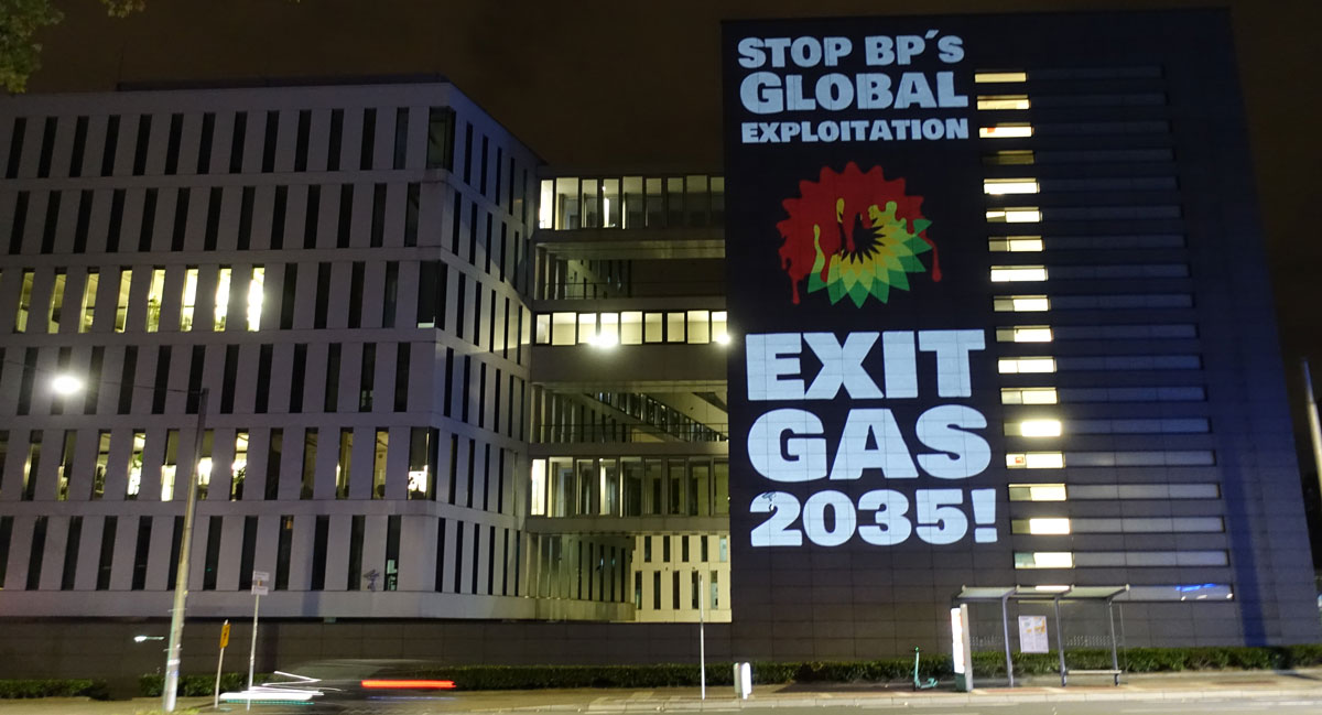 »BP ist einer von 57 Konzernen weltweit, der für 80% aller Treibhausgasemissionen seit 2016 verantwortlich ist. Er ist für die Erfindung des „Carbon Footprint“ verantwortlich, der die Schuld der Klimazerstörung auf die Verbraucher*innen lenken soll. Zudem ist der Konzern verantwortlich für die „Deep Water Horizon Katastrophe“, eine der größten Umweltkatastrophen durch fossile Brennstoffe weltweit.