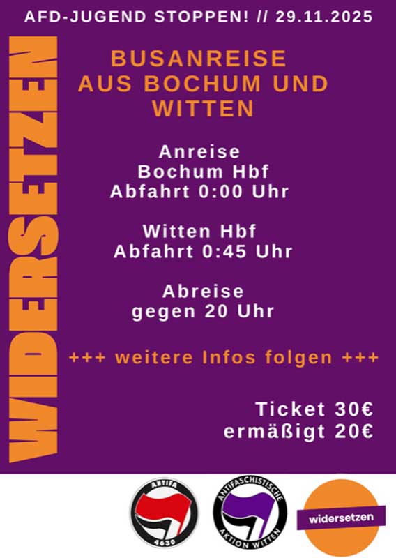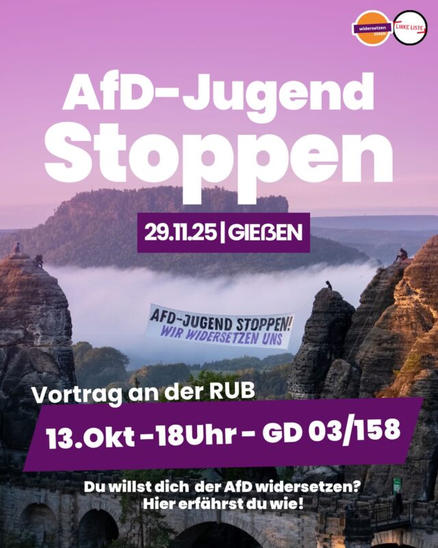 Der bisherige Jugendverband der AfD hat sich kurz vor seinem zu erwartenden Verbot aufgelöst. Ende November soll es eine Neugründung geben. Die Kampagne „Widersetzen“ will das verhindern und schreibt: »Am 29. und 30. November will die AfD in Gießen eine neue Jugendorganisation gründen – mit abgewandeltem Reichsadler und Namen wie „Junge Patrioten“ oder „Patriotische Jugend“. Die AfD möchte eine neue Generation gewaltbereiter Faschist*innen heranziehen. Wir stellen uns der Normalisierung der AfD und der Neugründung ihrer Jugendorganisation in Gießen in den Weg! Wir veranstalten ein Fest der Vielfalt und Solidarität und machen so die Gründung der AfD-Jugend unmöglich. Die Vorbereitung auf Anreise und Aktionen laufen.« Am Montag, dem 13. Oktober findet hierfür ein Vortrag an der RUB statt: um 18 Uhr im Raum GD 03/158.