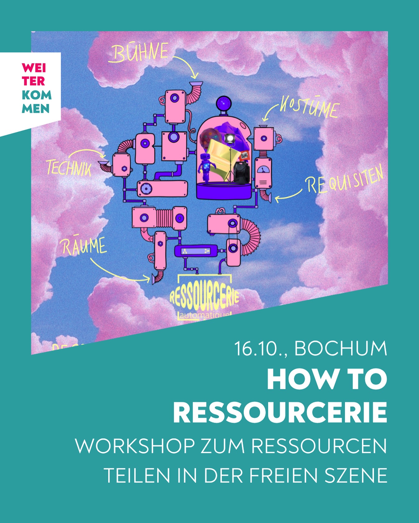 „Bringt eure Laptops und bis zu fünf Ressourcen (Requisiten, Kostümteile oder andere Materialien aus euren Projekten) mit, die ihr gern mit anderen teilen wollt und wir machen gemeinsam den ersten Schritt in Richtung dezentrales Materiallager NRW! Willkommen in der ressourcerie! Nebenbei lernt ihr die Grundlagen der Share-Economy kennen, ebenso wie aktuelle Entwicklungen und Projekte im Bereich Material-Sharing.«