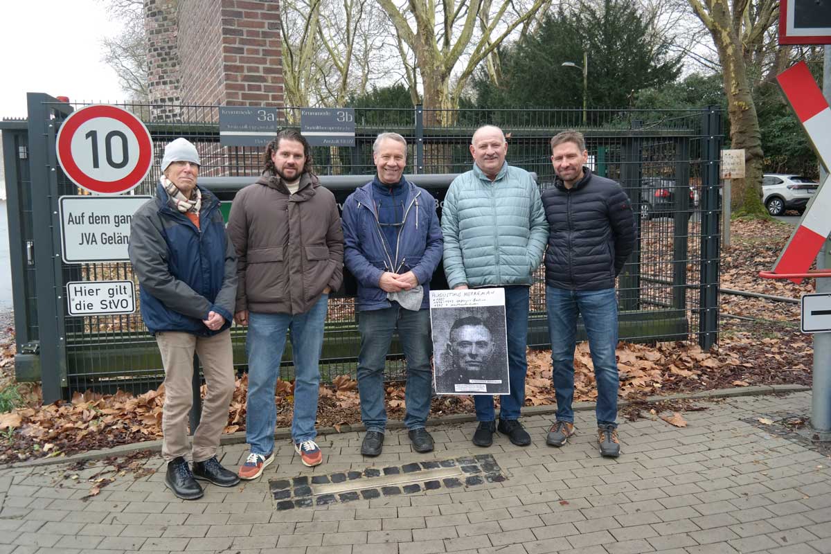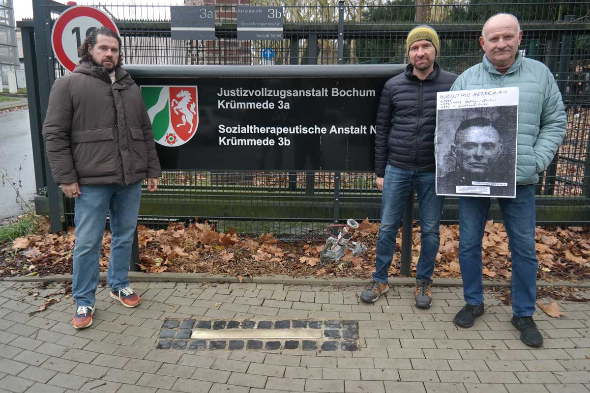 Nach dreieinhalbstündiger Fahrt durch Belgien und die Niederlande kommen Frankie und seine Söhne am 6. Dezember pünktlich an der Krümmede an, finden trotz VfL-Heimspieles in der Nähe einen Parkplatz. Ihr erster Blick nach Umrundung der hohen Anstaltsmauer gilt der neuen Stolperschwelle am Haftgelände-Eingang. Sie entdecken schnell den eingravierten Hinweis, dass unter den über 2000 Politischen Gefangenen in den NS-Jahren auch „Angehörige des Widerstandes aus Frankreich, Belgien und anderen besetzten Ländern Westeuropas“ waren. Uli Borchers putzt auf die Schnelle noch einmal die schwarz angelaufene Schwelle blank. Vom Parkhaus aus kann auch der Flügel A erblickt werden, in dem 1942 die meisten NN-Gefangenen inhaftiert waren. Flügelbezeichnungen und Zellennummern der modernen Anstalt sind immer noch dieselben wie vor über 80 Jahren.