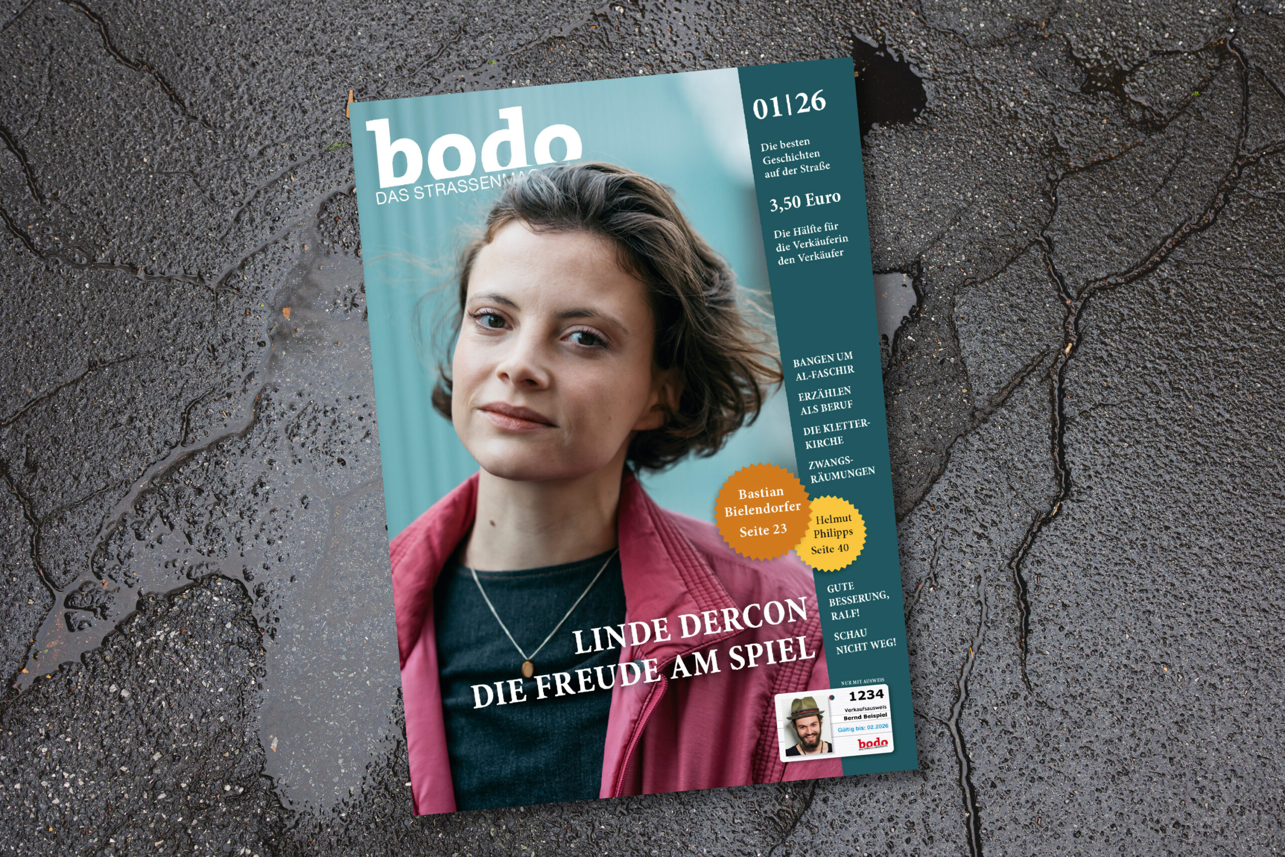 Heute, am 30. Dezember, erscheint die Januarausgabe des Straßenmagazins und das enthält diese Ausgabe: „Eine Schauspielerin, ein Musiker, Produzent und Autor, eine Stadtforscherin, ein Geschichtenerzähler, die BewohnerInnen einer Notschlafstelle, ein Comedian, eine Gruppe Bochumer SudanesInnen, die Betreiberin einer „Kletterkirche“, ein Staubforscher“. Die Redaktion schreibt zum Inhalt: »Auf dem Titel: Bei Linde Dercon lief lange alles auf eine Laufbahn am Theater zu. Sie stand schon als Kind auf der Bühne, begann ein Schauspielstudium in Amsterdam – dann bekam sie Zweifel. Als Ensemblemitglied am Schauspielhaus Bochum erarbeitet sie sich gerade den Spaß am Spiel zurück.
