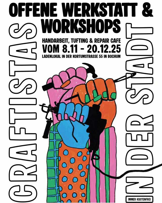 Das atelier automatique macht auf ein kreatives Projekt aufmerksam: »Unter dem Titel „Craftistas in der Stadt“ laden drei Bochumer Künstlerinnen im November und Dezember in ihrem Pop-Up in der Innenstadt (Kortumstr. 55) zu kreativen Werkstätten und Workshops ein. Die Künstlerinnen – das sind Sophie Ziser (Secco Handmade), Kathlina Anna Reinhardt (FLIP PIECE) und Josefine Rose Habermehl (end or fine Veränderungsatelier). Craftista versteht Crafting als eine Form des Aktivismus – als bewusste, gemeinschaftliche Praxis des Selbermachens, Reparierens und Wiederverwendens.
