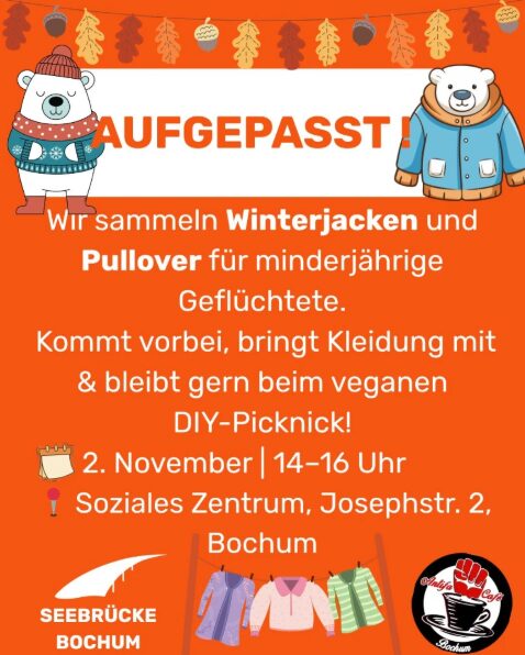 Mitglieder der Seebrücke Bochum sammeln zusammen mit Menschen des Offenen Antifacafes am Sonntag, 2.11.25, 14:00 – 16:00 während des veganen DIY-Picknicks Winterbekleidung und Pullover für unbegleitete minderjährige Geflüchtete.