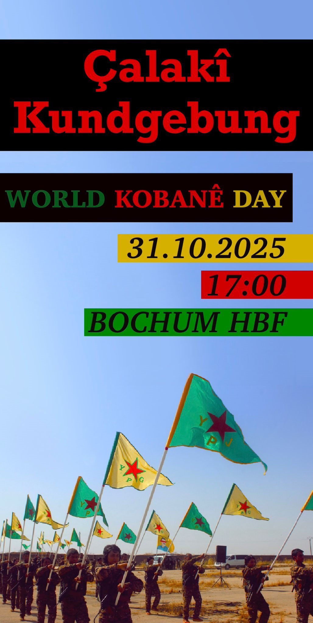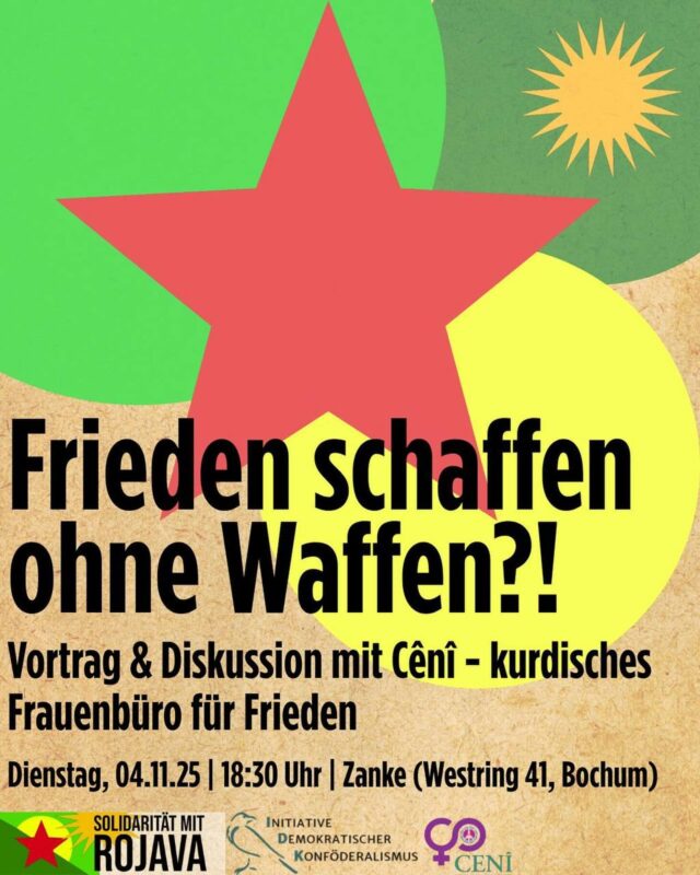Am Dienstag, den 04.11.2025, laden das Solibündnis für Rojava Bochum und die Initiative Demokratischer Konföderalismus Bochum um 18:30 Uhr in der Zanke zu einem Vortrag und mit anschließender Diskussion mit „Cênî – dem kurdischen Frauenbüro für Frieden e.V.“ ein: »Die Veranstaltung wird die aktuellen politischen Entwicklungen der kurdischen Frage in der Türkei in den Mittelpunkt stellen, sowie im Rahmen des Mottos „Frieden schaffen ohne Waffen?!“ die Waffenniederlegung der kurdischen Freiheitsbewegung und deren Einfluss auf den laufenden Friedensprozess, sowie auf die allgemeine Entwicklung der Bewegung in allen Teilen Kurdistans beleuchten.