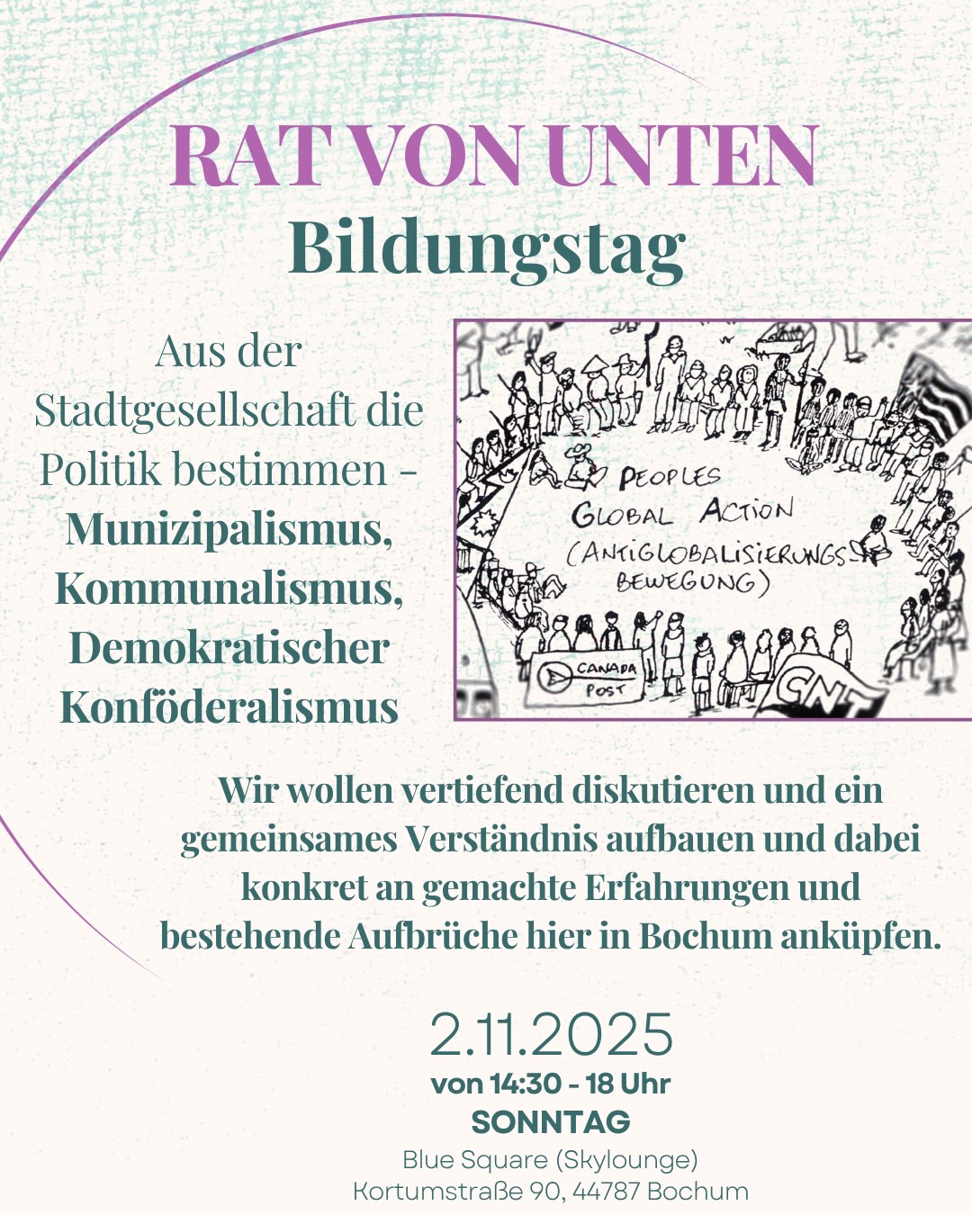 Der Rat von unten lädt zu einem „Bildungstag“ am 02.11.25, 14:30 – 18 Uhr ins Blue Square ein. »Aus der Stadtgesellschaft die Politik bestimmen – Munizipalismus, Kommunalismus, Demokratischer Konföderalismus Die Bildungsreihe des Rats von Unten geht in die 2. Runde! Anschließend an den Bildungstag zu unserem Geschichtsverständnis wollen wir nun unser Augenmerk auf die Gegenwart lenken.
