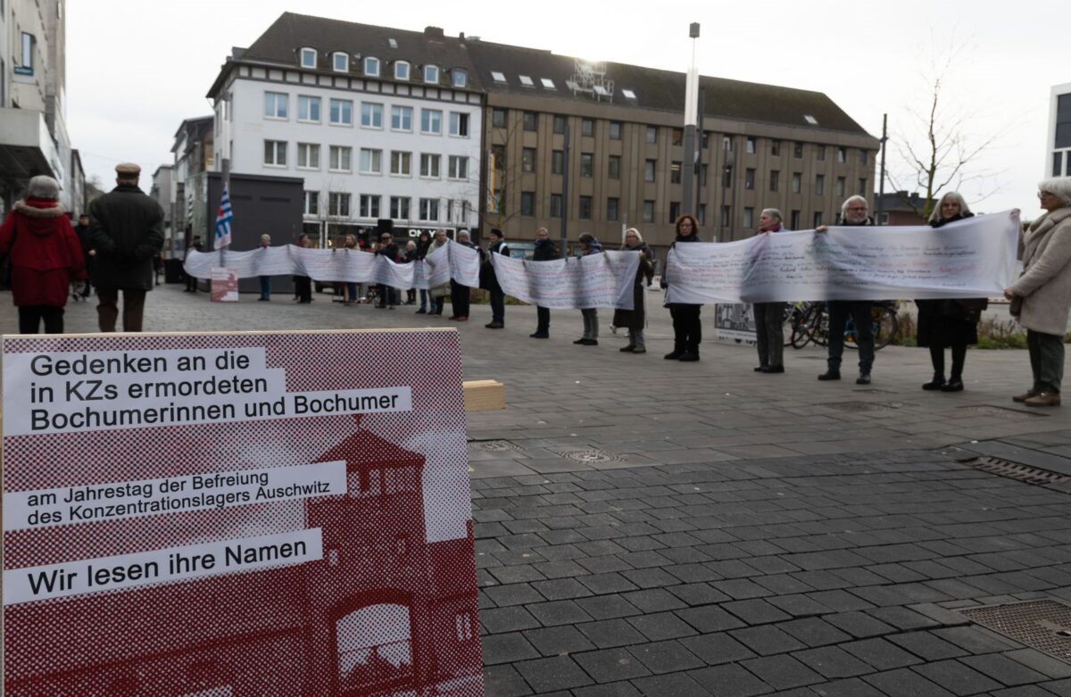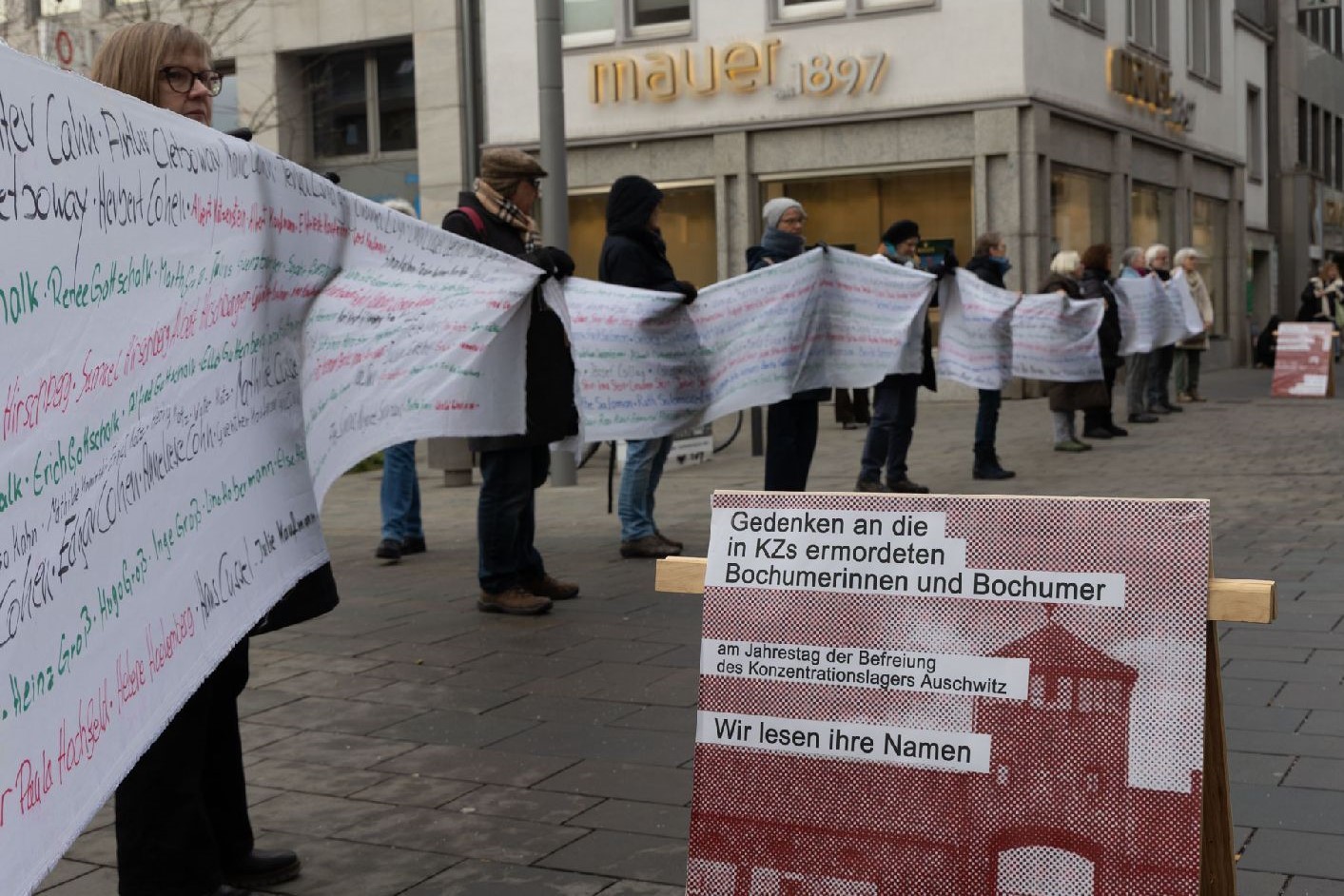 In Bochum wird seit vielen Jahren an diesem Tag an die jüdischen Bochumer Opfer gedacht. Ihre Namen sind auf langen Bannern aufgeschrieben und werden vorgelesen.