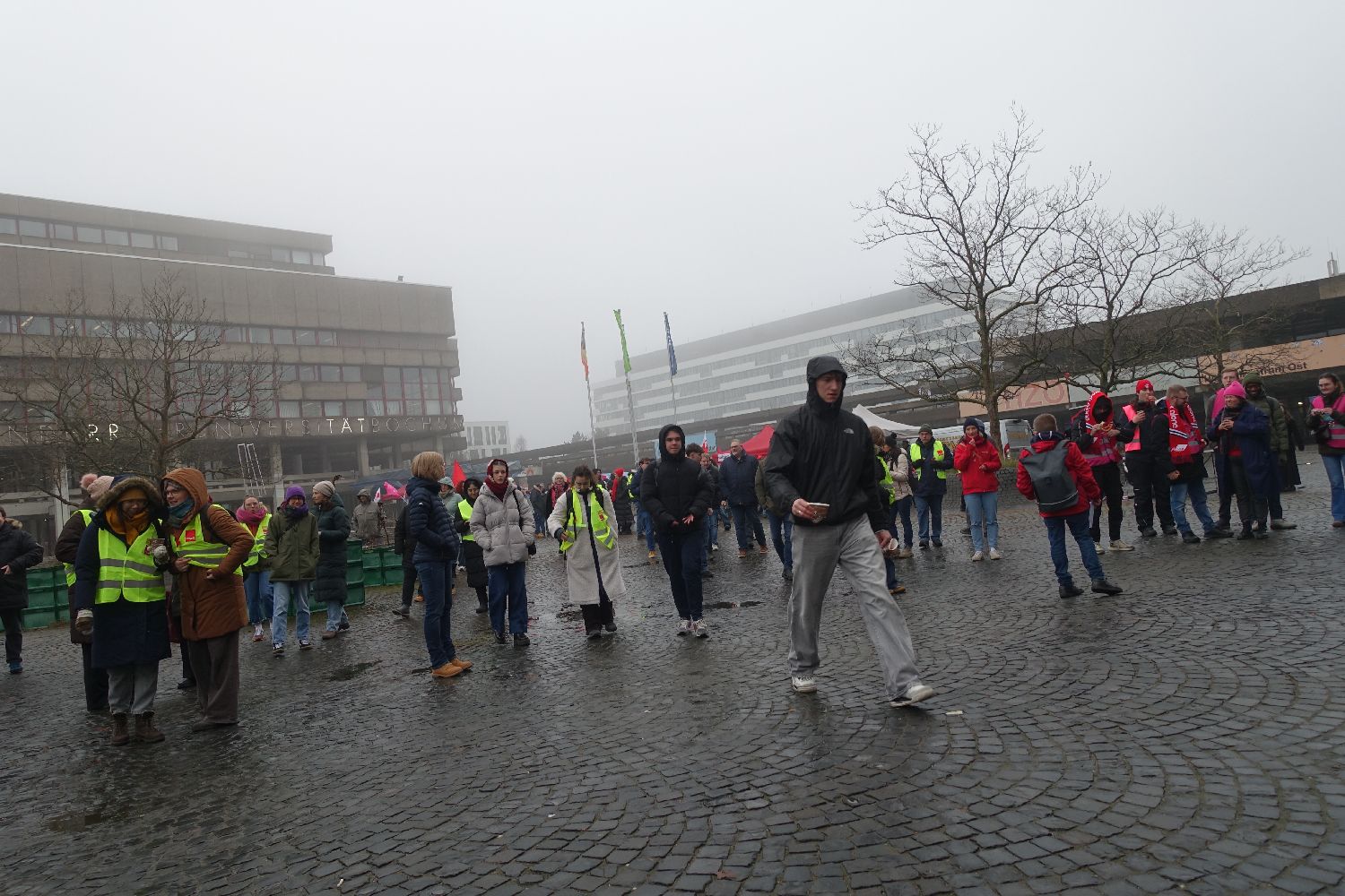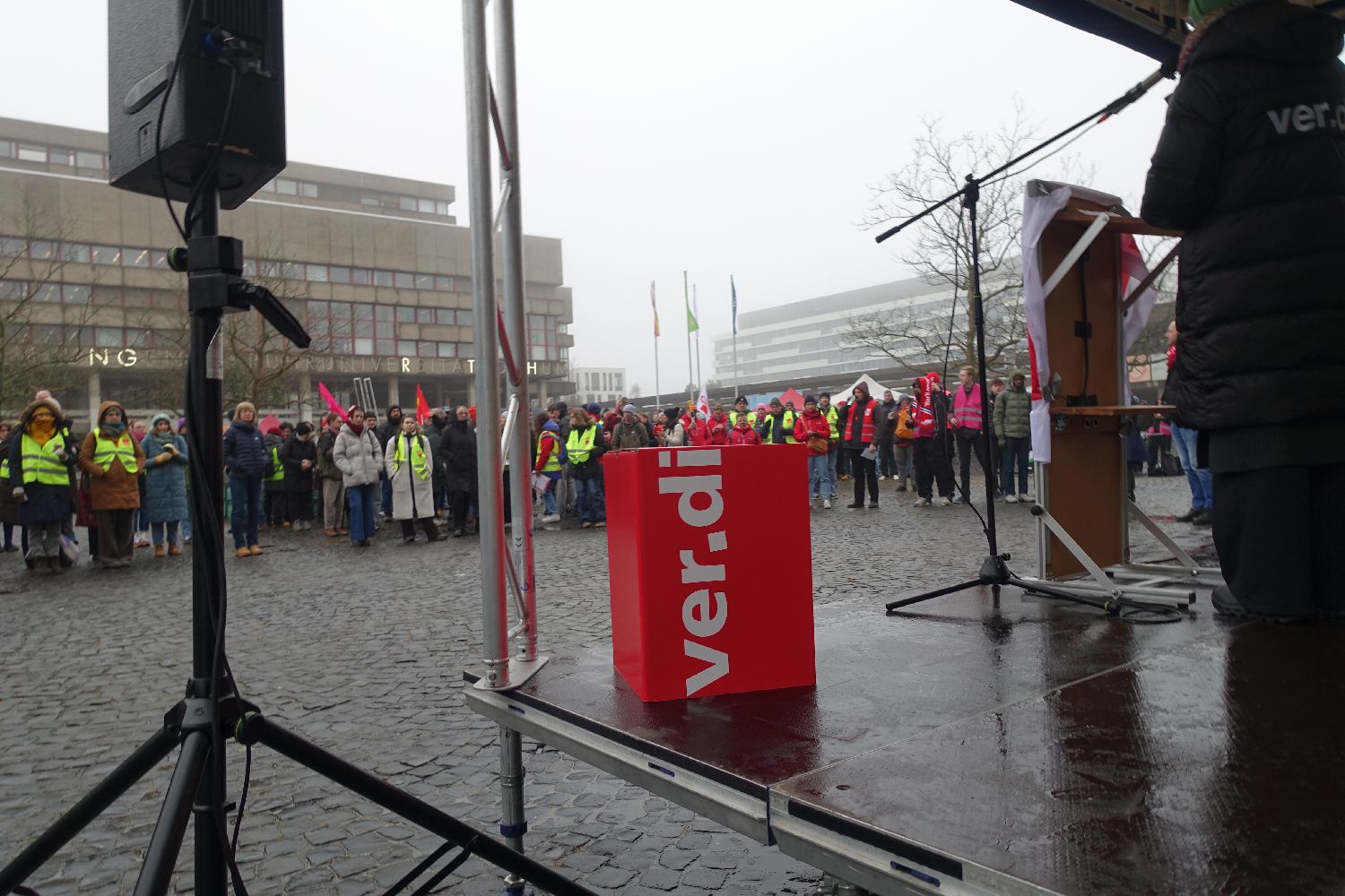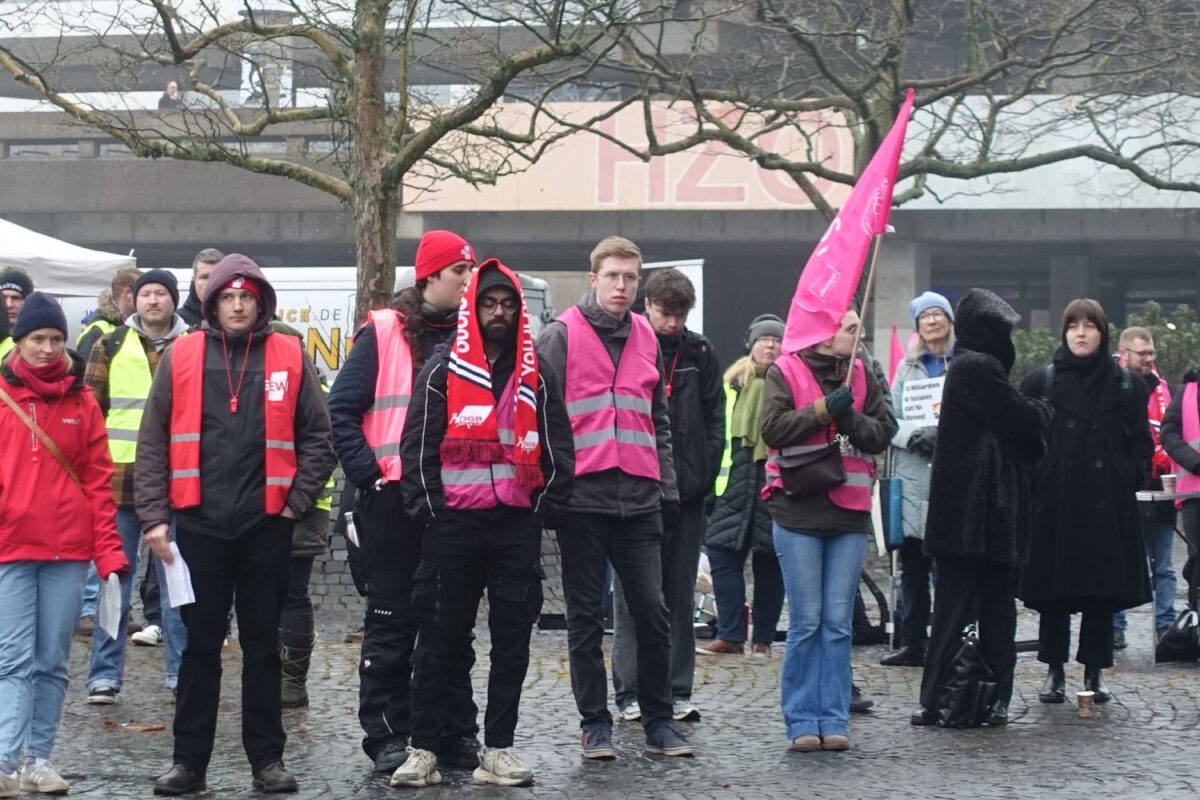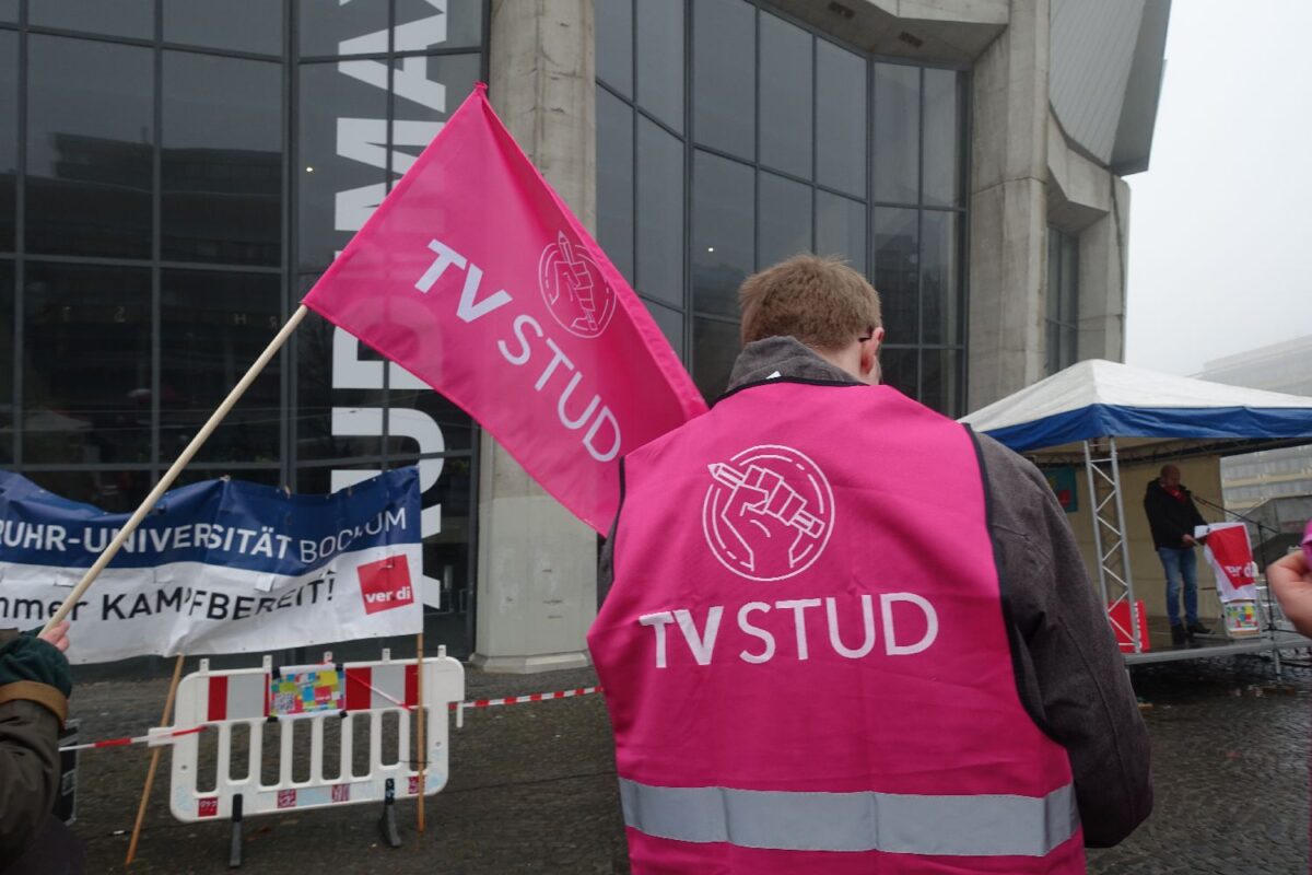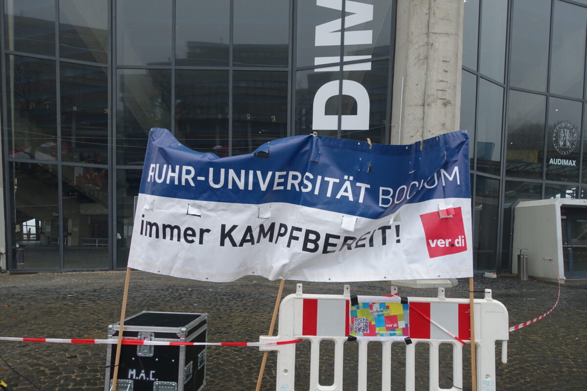 An der Ruhr-Uni fand gestern – wie an 80 anderen Hochschulen auch – ein Warnstreik statt. Auf der Kundgebung vor dem Audimax thematisierte der ver.di Geschäftsführer Ruhr Mitte Bernd Dreisbusch einen Skandal im Umgang mit studentischen Hilfskräften im Hochschulbereich: »Den 300.000 studentisch Beschäftigten verweigert die TDL [Tarifgemeinschaft deutscher Länder] weiterhin jeglichen Schutz durch einen Tarifvertrag. Ja, bin ich denn hier bei Amazon, nein, beim Land Nordrhein-Westfalen.«