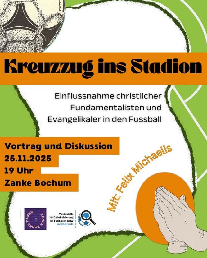 mehr…Das Fanprojekt NRW führt am kommenden Dienstag, 25. November, in der Zanke eine Veranstaltung zur Einflussnahme christlicher Fundamentalisten und Evangelikaler in den Fußball durch: »Dass radikal-christliche Organisationen versuchen, verschiedene Sportarten als Plattformen zu benutzen, um ihre fundamentalistischen und konservativen Botschaften gesellschaftsfähig zu machen, ist nichts Neues. Neu ist allerdings, dass sie anfangen, damit Erfolg zu haben!