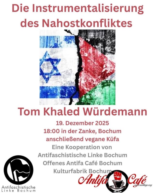 mehr…Das offene Antifa-Cafe Bochum lädt ein zur Informationsveranstaltung mit Tom Khaled Würdemann am Freitag, 19. 12. um 18 Uhr in der Zanke, Westring 41
