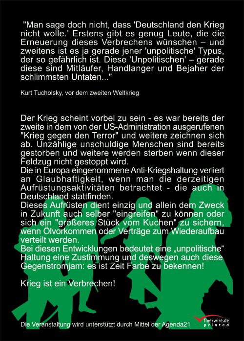 Rechtzeitig zu ihrem Antimilitarismus-Konzert am kommenden Freitag auf dem Dr.-Ruer-Platz hat das Projekt "Gegenstrom" eine eigene Webseite veröffentlicht. Die Pressemappe für das Konzert. |
