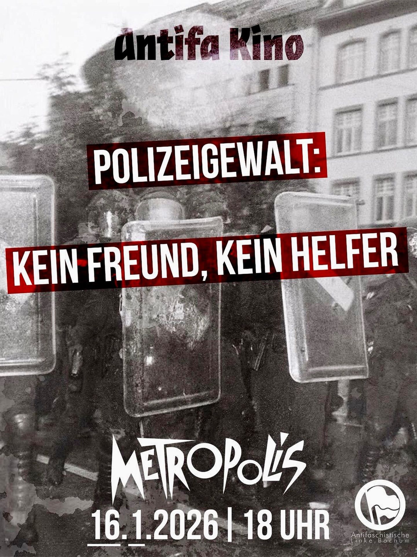 Die Antifaschistische Linke Bochum zeigt an 16.1. um 18 Uhr im Metropolis den Film „Polizeigewalt: Kein Freund, kein Helfer – Lorenz & die Einzelfälle“. Der Film schaut auf mehrere Fälle tödlicher Polizeigewalt und fragt nach strukturellen Mustern. Im Anschluss findet eine Podiumsdiskussion zum Film und zum aktuellen Fall in Bochum statt. Eintritt: Spende.
