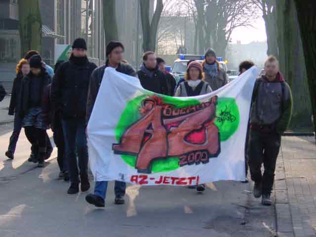 Gegen 13 Uhr zog ein Teil der Leute, die auch die Unterschriften an den Oberbürgermeister übergeben hatten zur Polizeiwache, um dort auf die in Gewahrsam genommenen BesetzerInnen zu warten.